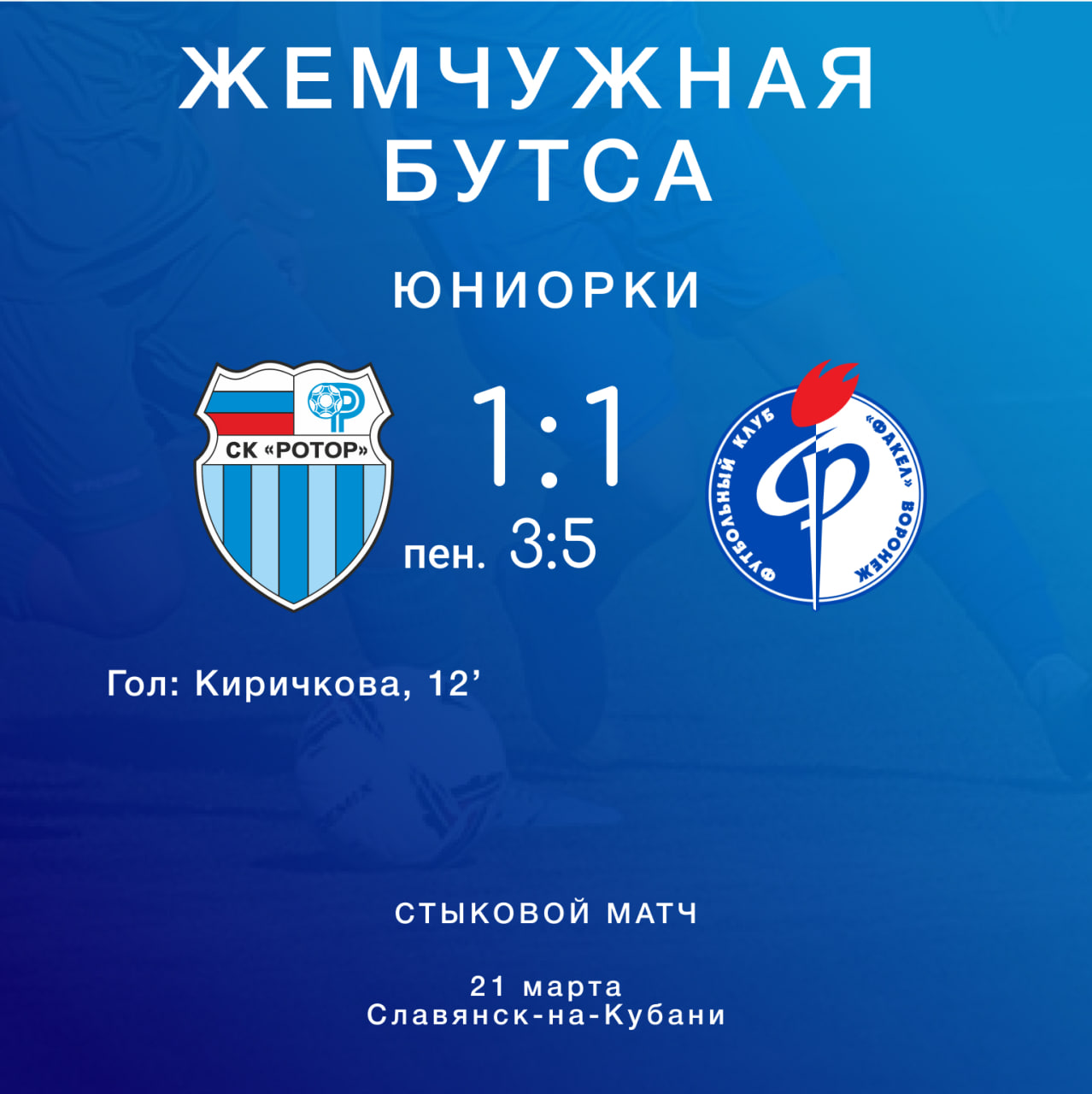 Футболистки из СШ «Ротор» в стыковом матче турнира «Жемчужная бутса» встречались с воронежским «Факелом». Большую часть времени «сине-голубые» вели со счётом 1:0 благодаря голу Камиллы Киричковой с пенальти. К сожалению, уже в добавленное время волгоградки пропустили ответный мяч. В серии пенальти удача отвернулась от СШ «Ротор» - 3:5.