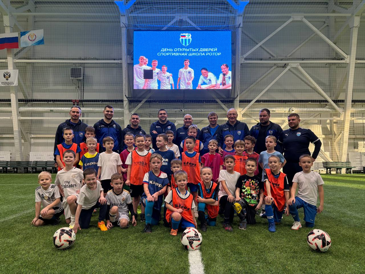 Сегодня «Спортивная школа «Ротор» провела день открытых дверей для юных футболистов в манеже имени Александра Никитина